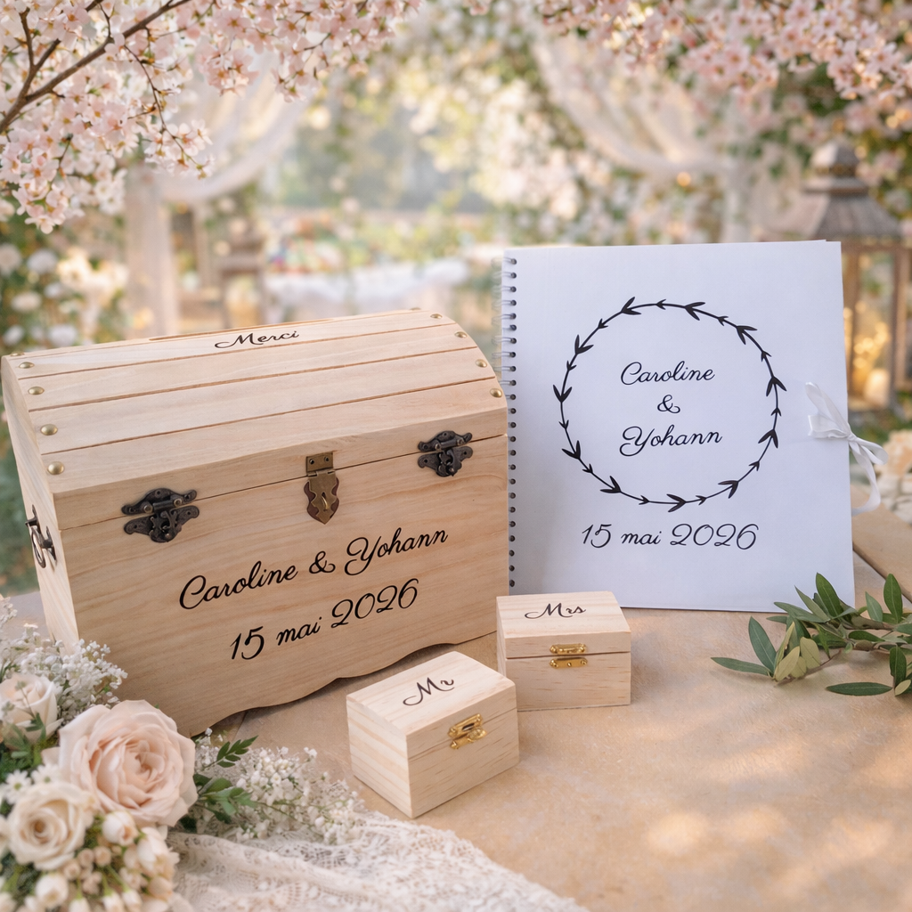 Découvrez mes collections d'urnes et coffres en bois, de coussins porte-alliances, de livres d'or, de jarretières et autres accessoires et décors, entièrement conçus selon vos envies et couleurs.