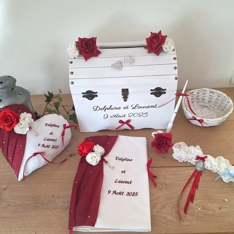 Offrez une touche de bordeaux à votre mariage, grâce à cette magnifique collection comprenant : un coffre bois, un livre d'or, un coussin d'alliances, une jarretière, un stylo et porte stylo, une corbeille