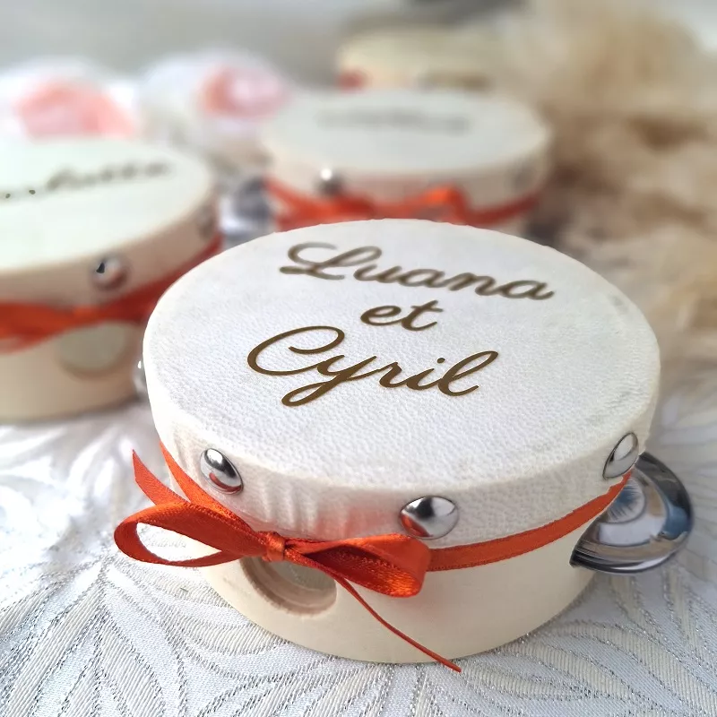 - Chaque tambourin est gravé selon vos envies : les prénoms des mariés, la date de l'événement, le prénom de chaque invité si plusieurs tambourins pour un marque-place original