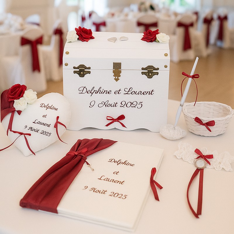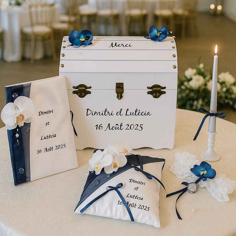 Découvrez mes collections d'urnes et coffres en bois, de coussins porte-alliances, de livres d'or, de jarretières et autres accessoires et décors, entièrement conçus selon vos envies et couleurs.